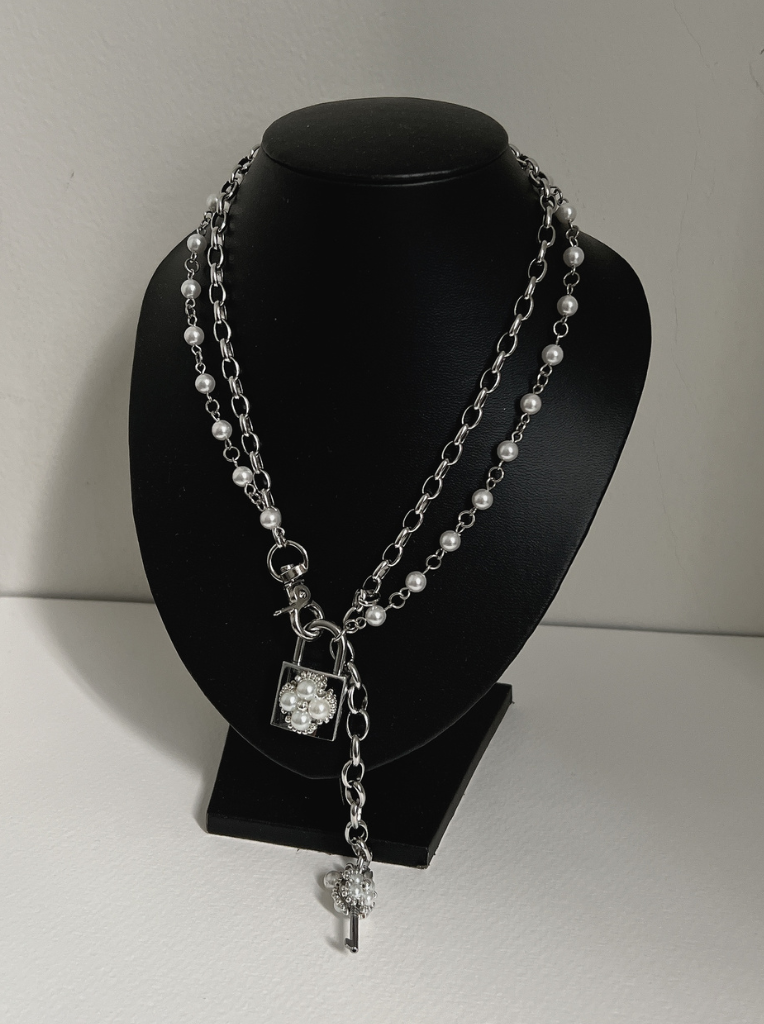 Stainless chain and hand-beaded sachi clover charms. Length 40+5cm.